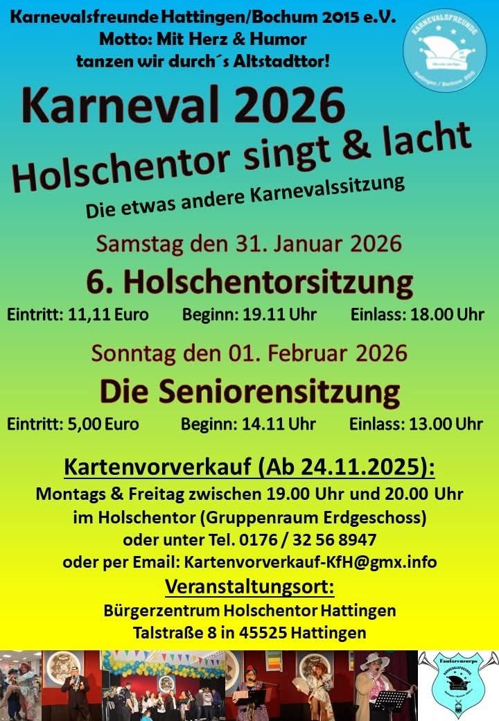 01.02.2026 Sonntag, 14:11 - 18:00 Uhr Holschentor (Zentrum f. bürgerschaftl. Engagement) | Die Seniorensitzung Die Karnevalsfreunde Hattingen/Bochum 2015 e.V. veranstalten auch in diesem Jahr wieder eine speziell auf Senioren zugeschnittene Karnevalssitzung mit Tanz, Gesang, Humor, der 3.Hattingen Altstadtprinzessin Nicole I und besonderen Überraschungen.