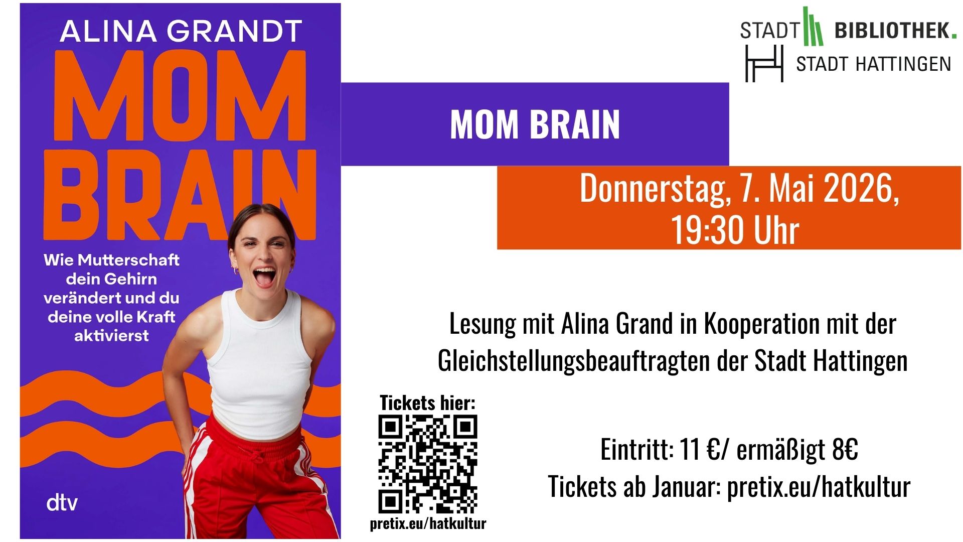 In der Schwangerschaft verändert sich nicht nur der Körper, sondern auch das Gehirn Alina Grandt erklärt, wie dieser neuropsychologische Wandel Müttern neue Fähigkeiten wie Empathie und Resilienz verleiht. Mit wissenschaftlicher Basis und klarer Sprache zeigt sie, was wirklich im Gehirn passiert und wie Mütter inmitten großer Veränderungen Orientierung finden können. Auto*in bekannt durch den Podcast „Mom Brain Reloaded“. Kooperationsveranstaltung mit der Gleichstellungsbeauftragten der Stadt Hattingen. Veranstaltungsort: