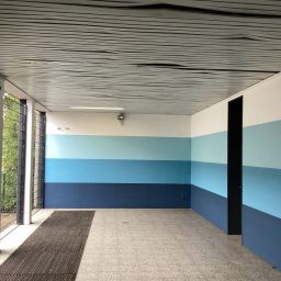 An der Grundschule Niederwenigern gab es viel Vandalismus. Vor alle in der offenen Pausenhalle gab es Unmengen von Verschmutzungen. Ohne Einzäunung des gesamten Schulhofes oder der Möglichkeit der Videoüberwachung hat sich die Gebäudewirtschaft entschlossen die offene Pausenhalle mit einer Zaunanlage abzuschließen und diesem Raum einen neuen grundschulgerechten Anstrich zu verleihen. Die Toranlage ist während der Schulnutzung ganz offen. Die Kunst AG der Schule möchte an der Wand noch Fische dazu gestalten.