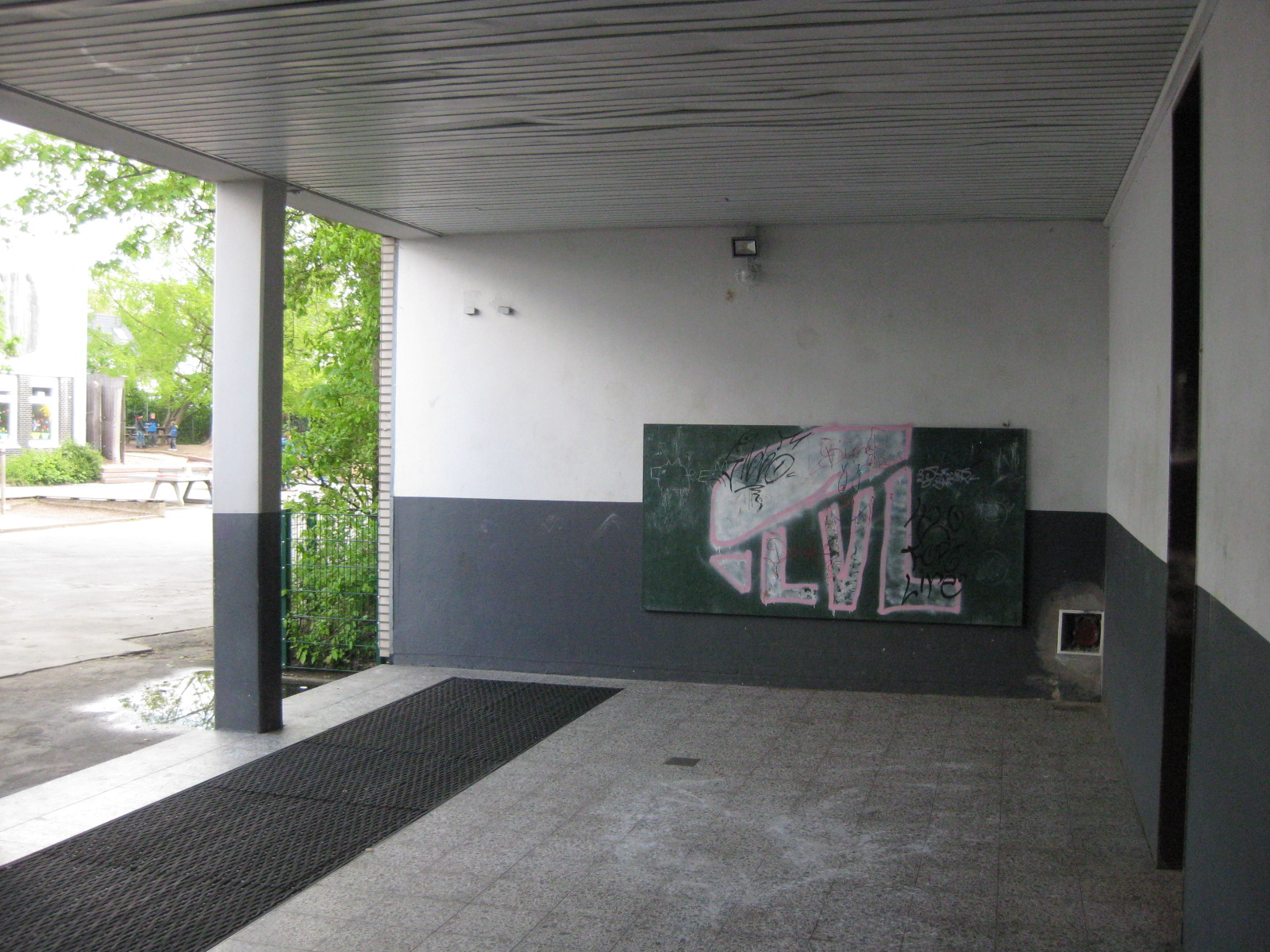 An der Grundschule Niederwenigern gab es viel Vandalismus. Vor alle in der offenen Pausenhalle gab es Unmengen von Verschmutzungen. Ohne Einzäunung des gesamten Schulhofes oder der Möglichkeit der Videoüberwachung hat sich die Gebäudewirtschaft entschlossen die offene Pausenhalle mit einer Zaunanlage abzuschließen und diesem Raum einen neuen grundschulgerechten Anstrich zu verleihen. Die Toranlage ist während der Schulnutzung ganz offen. Die Kunst AG der Schule möchte an der Wand noch Fische dazu gestalten.
