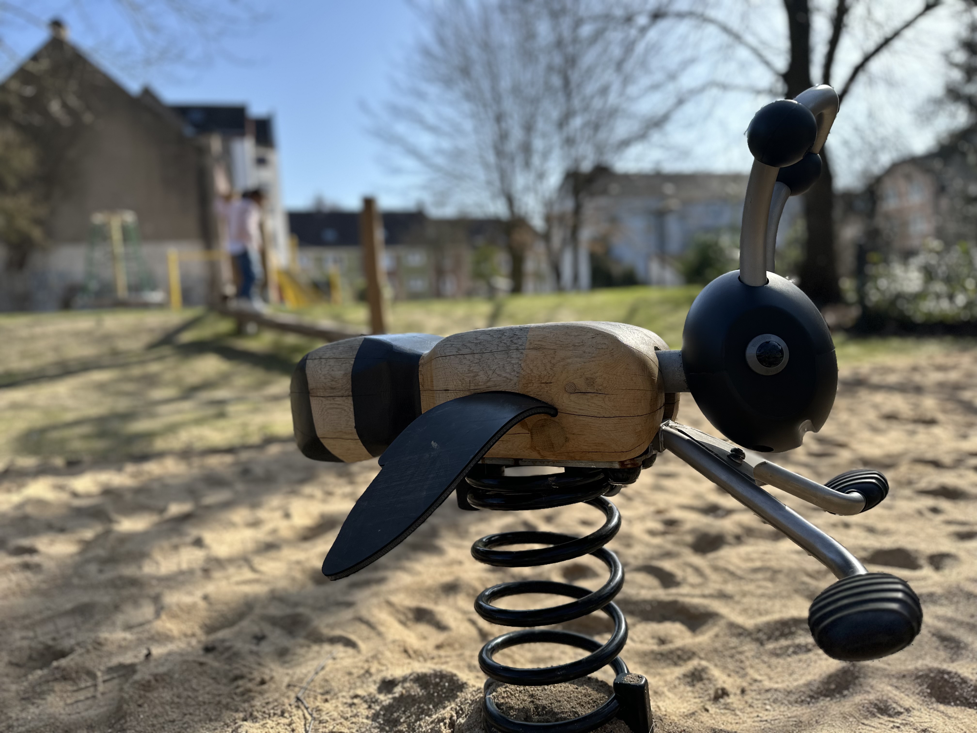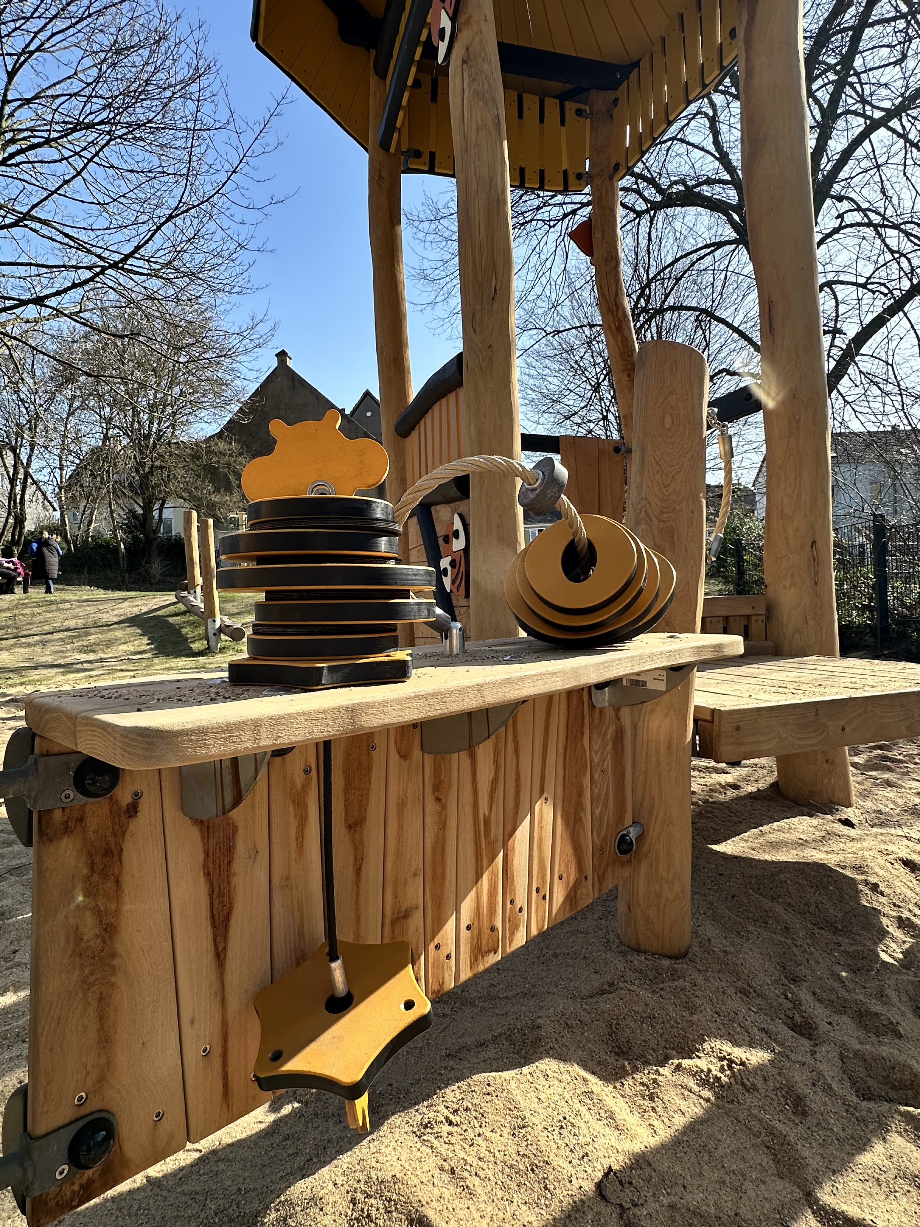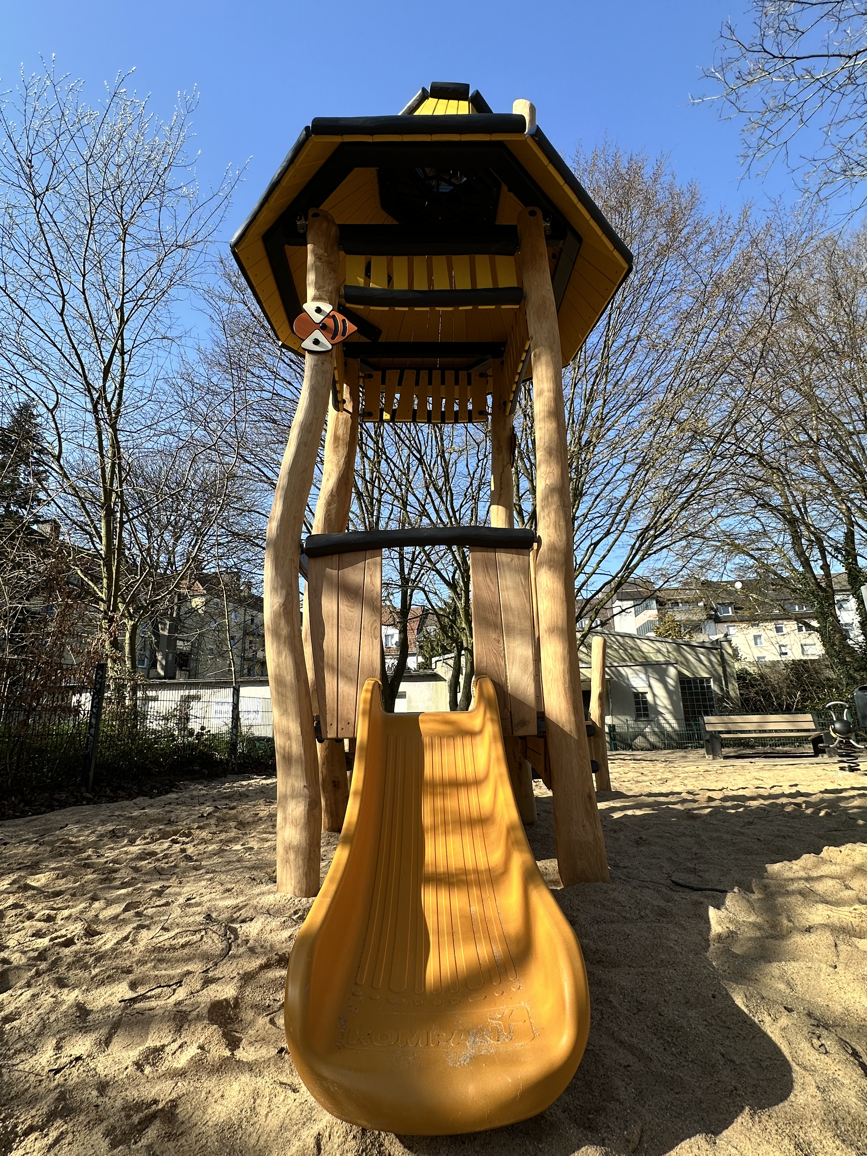Die Spielfläche ist weiterhin in oberen und unteren Bereich gegliedert. Unterer Bereich: Eine liebevoll gestaltete Bienen- und Honigwelt für Kleinkinder. Zudem gibt es eine Kleinkindschaukel mit Blumenmotiven, Wipptiere in Bienenform und ein neuer Sandspielbereich.