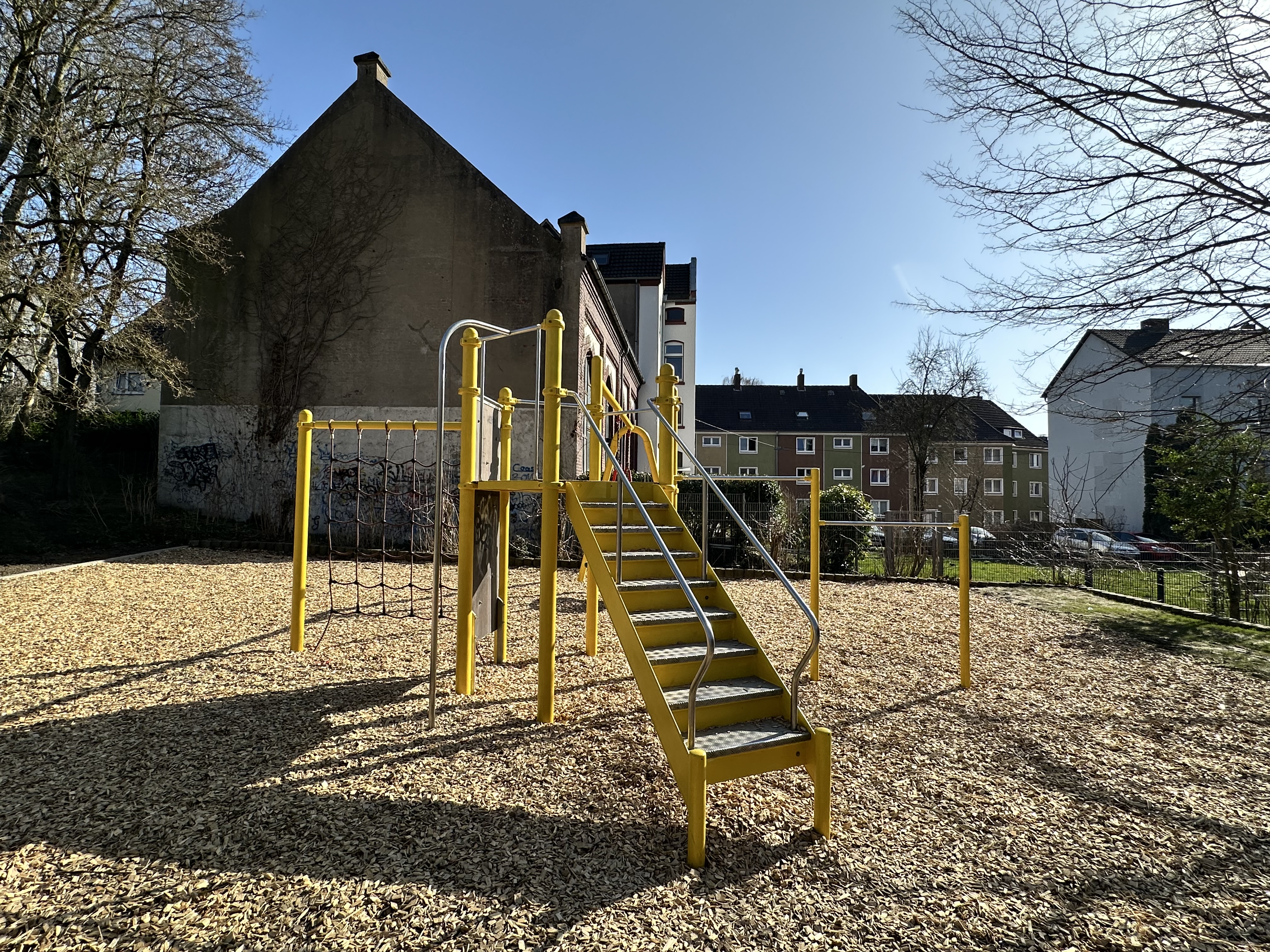 Oberer Bereich: Die vorhandenen Spielgeräte sind erhalten geblieben (neu gestrichen). Es gibt ein neues inklusives Dreh- und Klettergerät sowie eine neue Slackline. Beide Ebenen sind durch Kletterparcours miteinander verbunden.