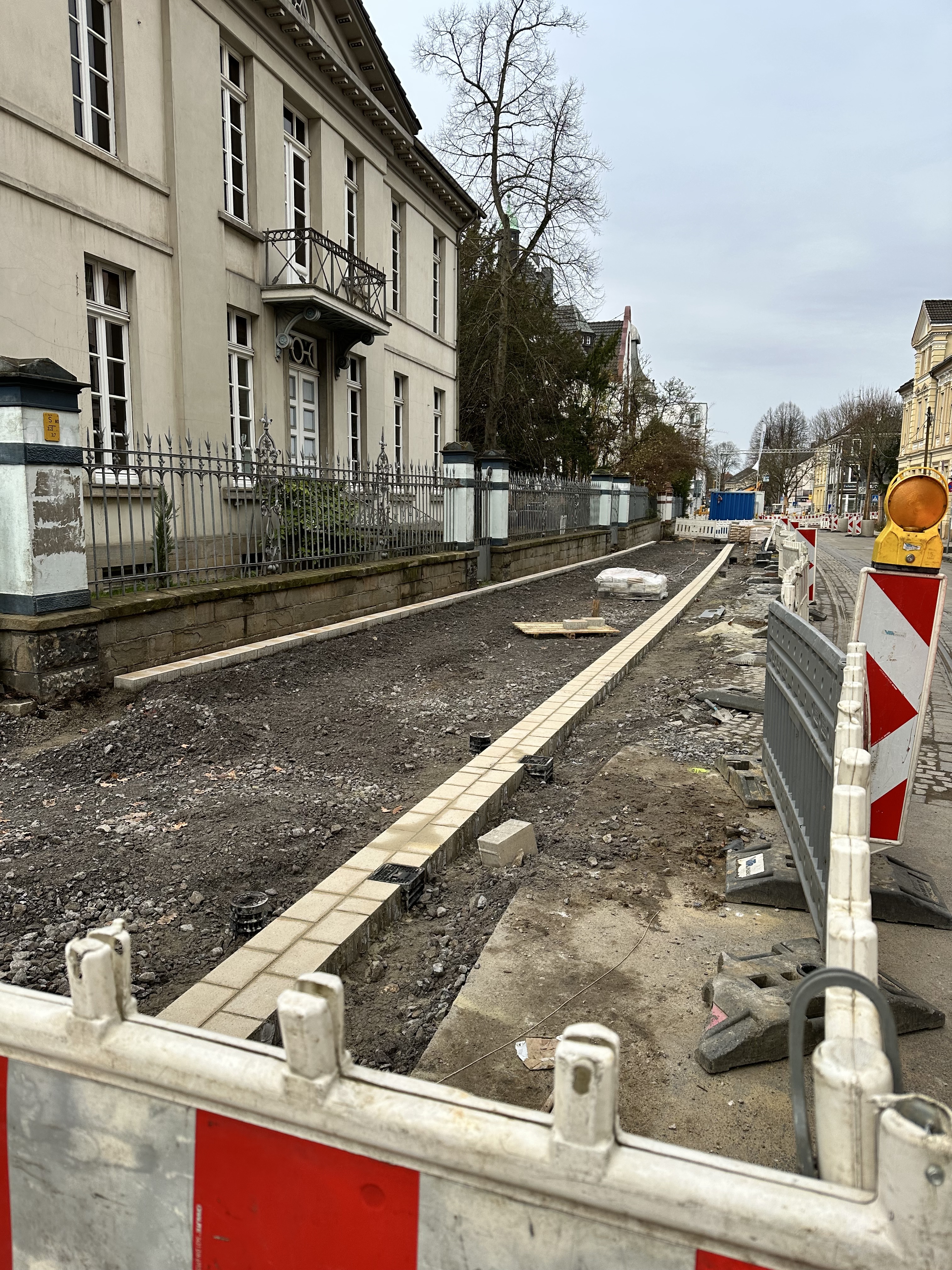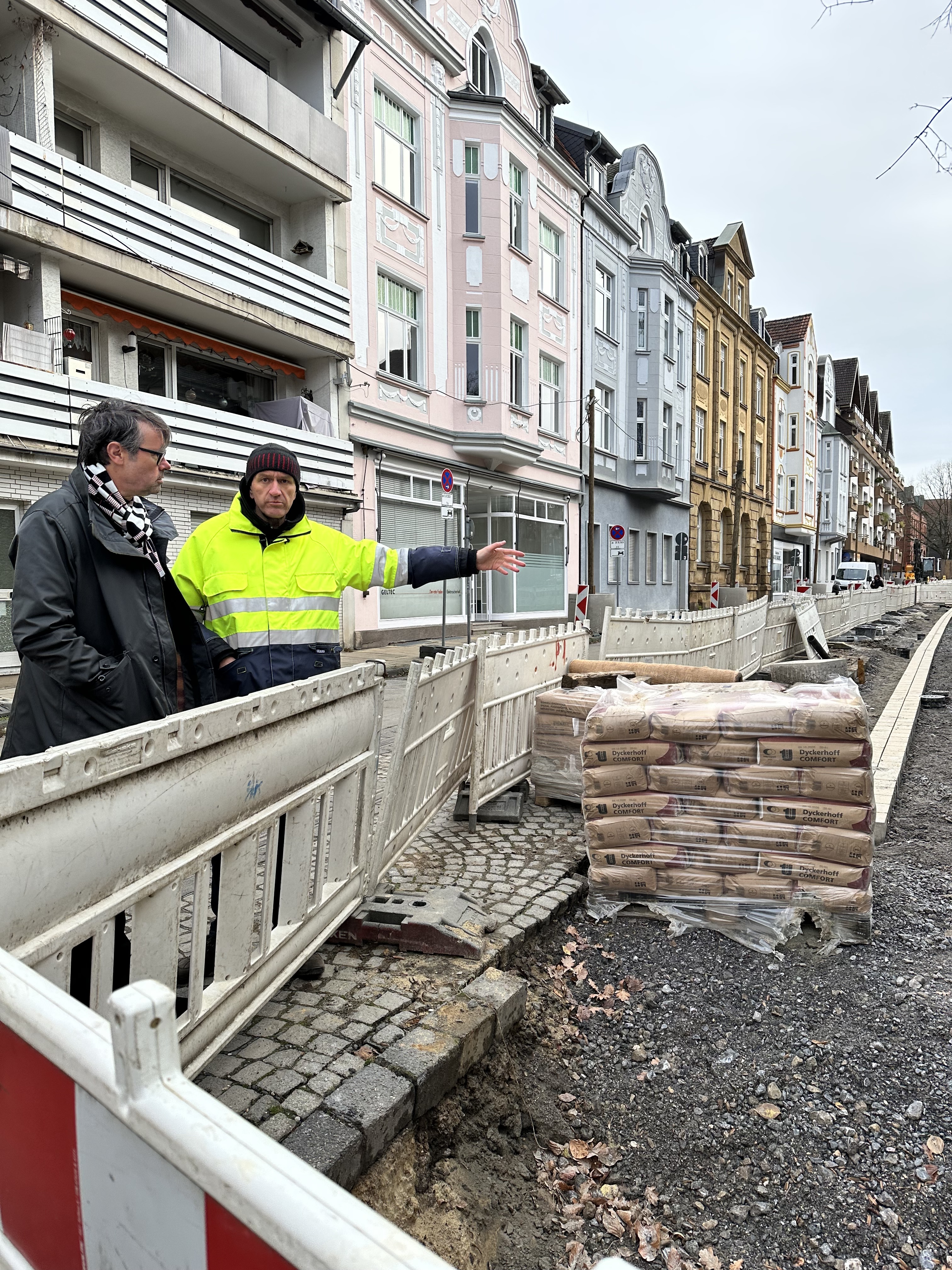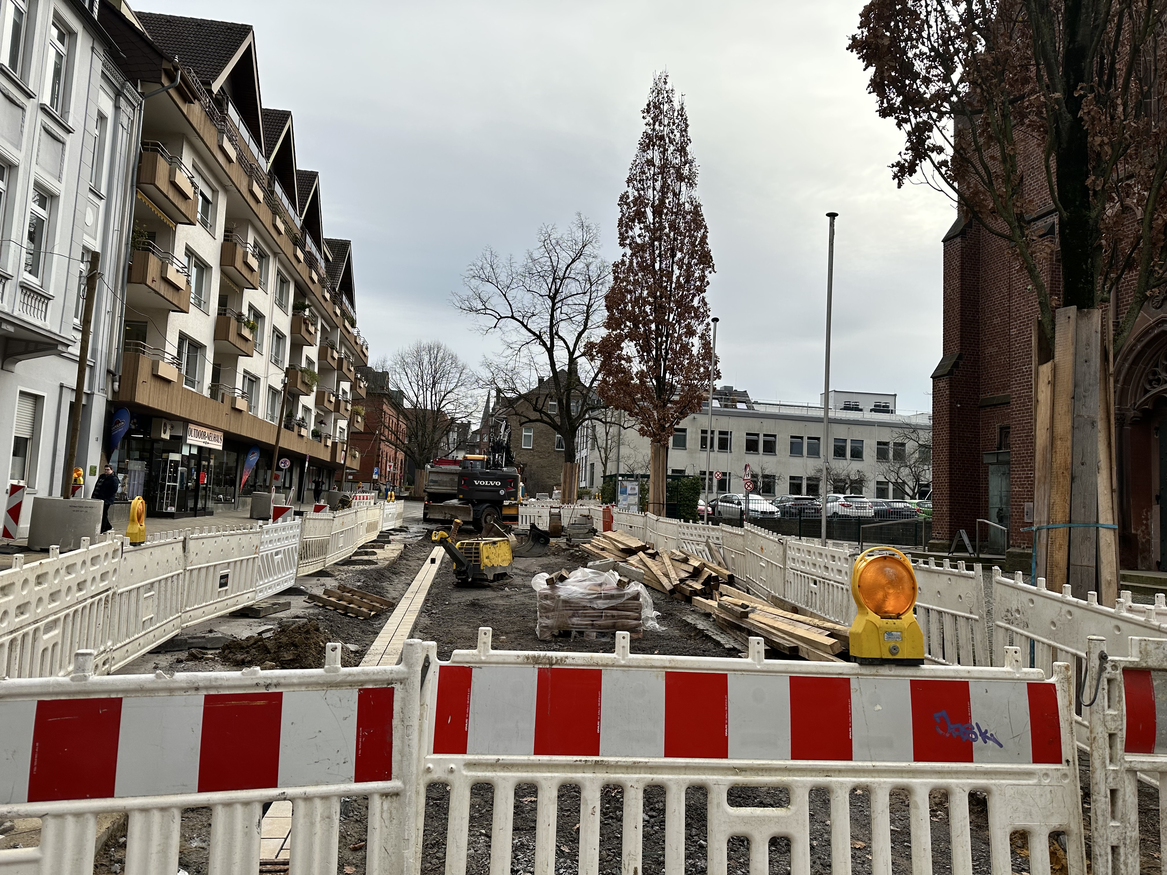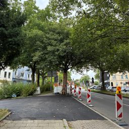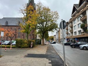 Zu Weihnachten wird die Zufahrt zur Kirche wieder hergestellt sein und dann wird weiter in Richtung August-Bebel-Straße gearbeitet. Die Gehwege auf der anderen Straßenseite werden dann in einem nächsten Bauabschnitte erneuert, dort werden auch Pflanzkübel eingebracht. Die Straße wird anschließend 5,5 Meter breit sein und es ist Tempo 20 vorgesehen. Gehwege und Fahrbahn sind höhengleich und heben sich optisch durch Material und Farbe voneinander ab.