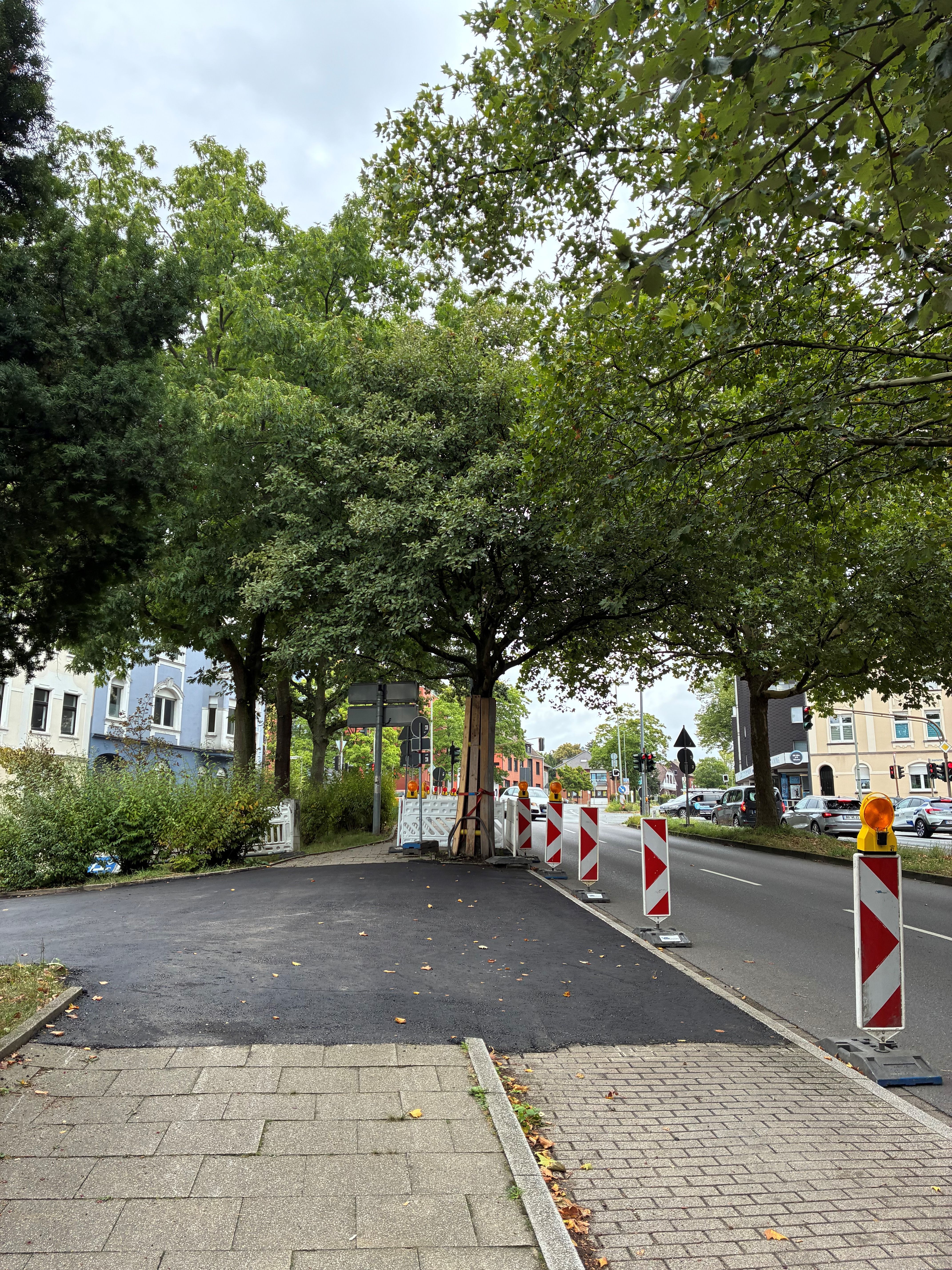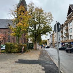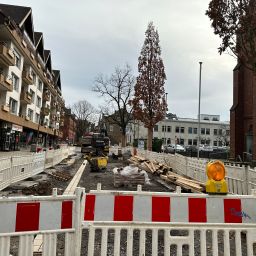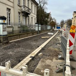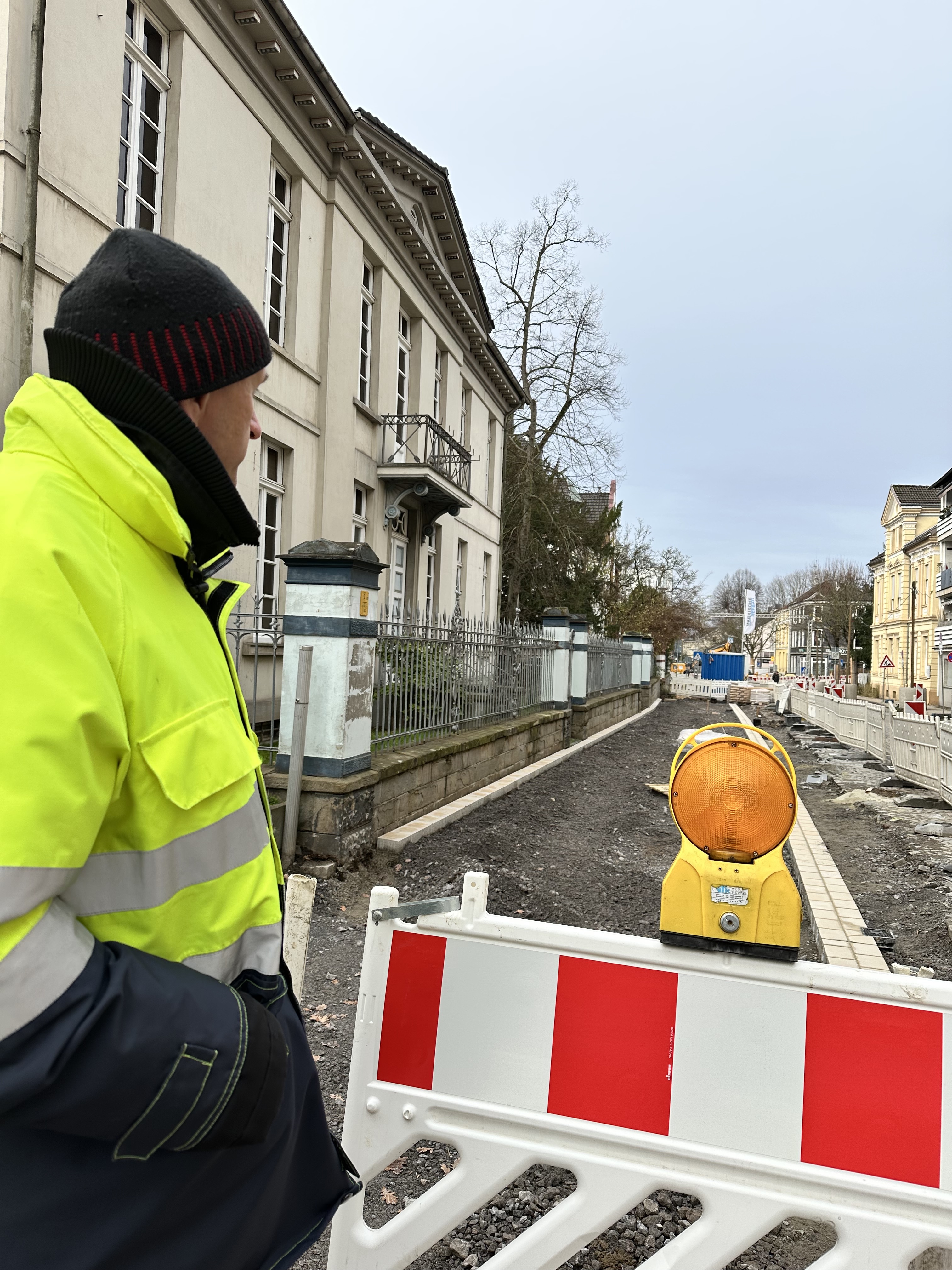 Zu Weihnachten wird die Zufahrt zur Kirche wieder hergestellt sein und dann wird weiter in Richtung August-Bebel-Straße gearbeitet. Die Gehwege auf der anderen Straßenseite werden dann in einem nächsten Bauabschnitte erneuert, dort werden auch Pflanzkübel eingebracht. Die Straße wird anschließend 5,5 Meter breit sein und es ist Tempo 20 vorgesehen. Gehwege und Fahrbahn sind höhengleich und heben sich optisch durch Material und Farbe voneinander ab.