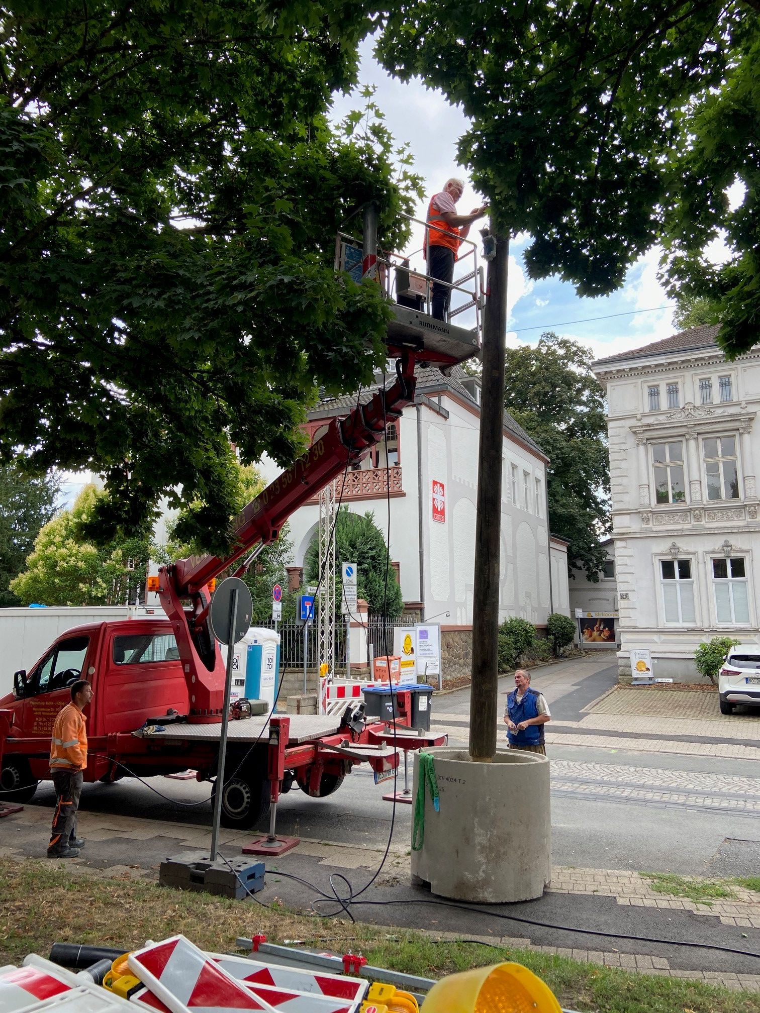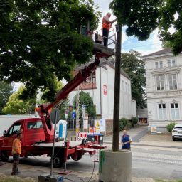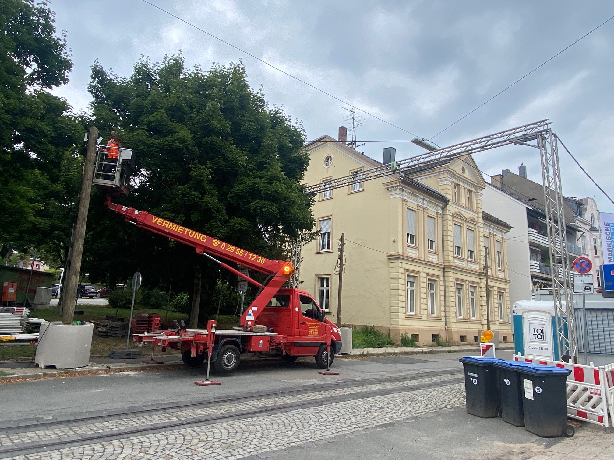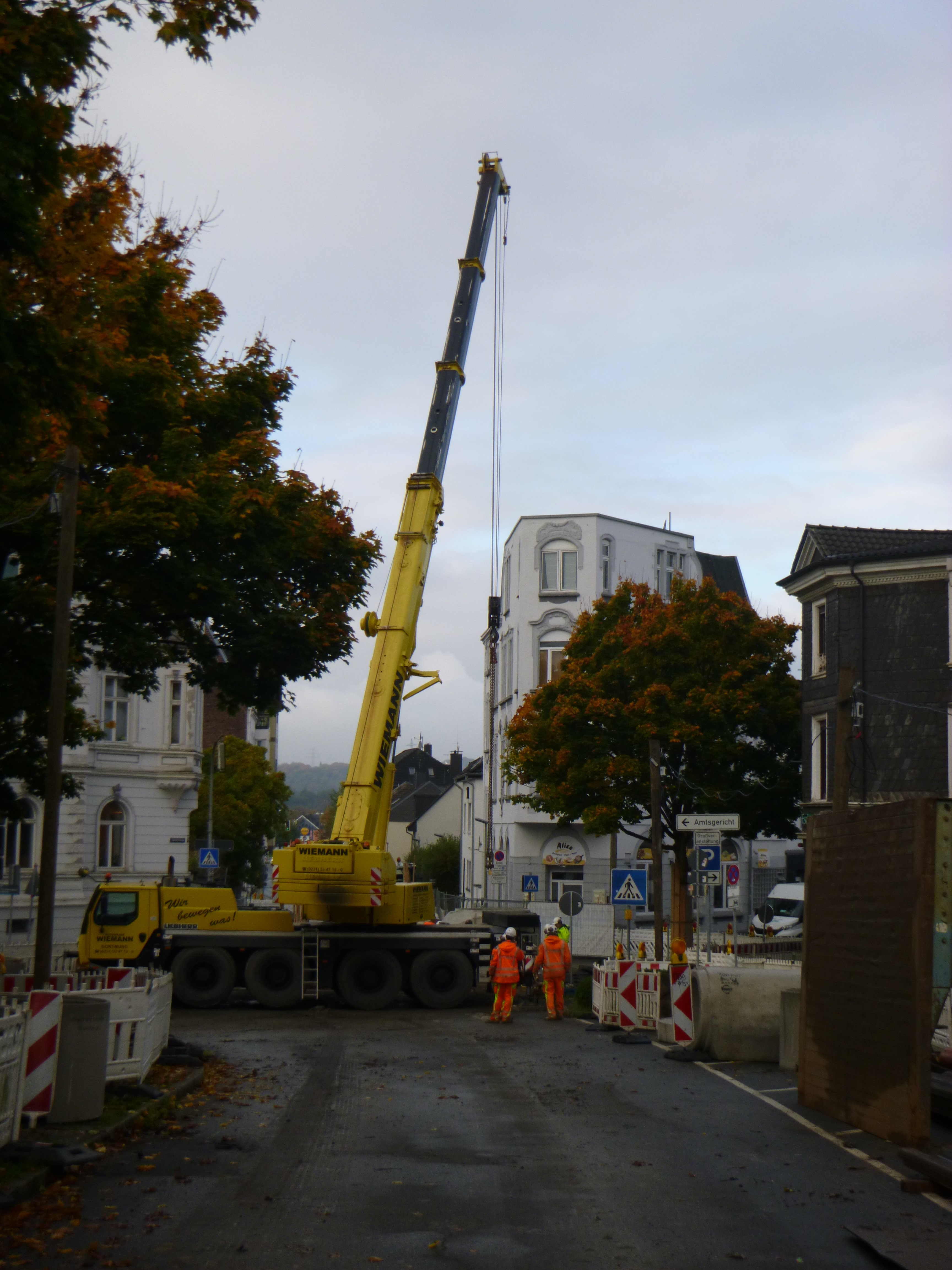 Straßenbeleuchtung wird entfernt und durch provisorische Beleuchtung ersetzt. Kanalbaumaßnahme des Ruhrverbandes in der Kreisstraße/Wülfingstraße wird vorbereitet. Baustelle wird eingerichtet.