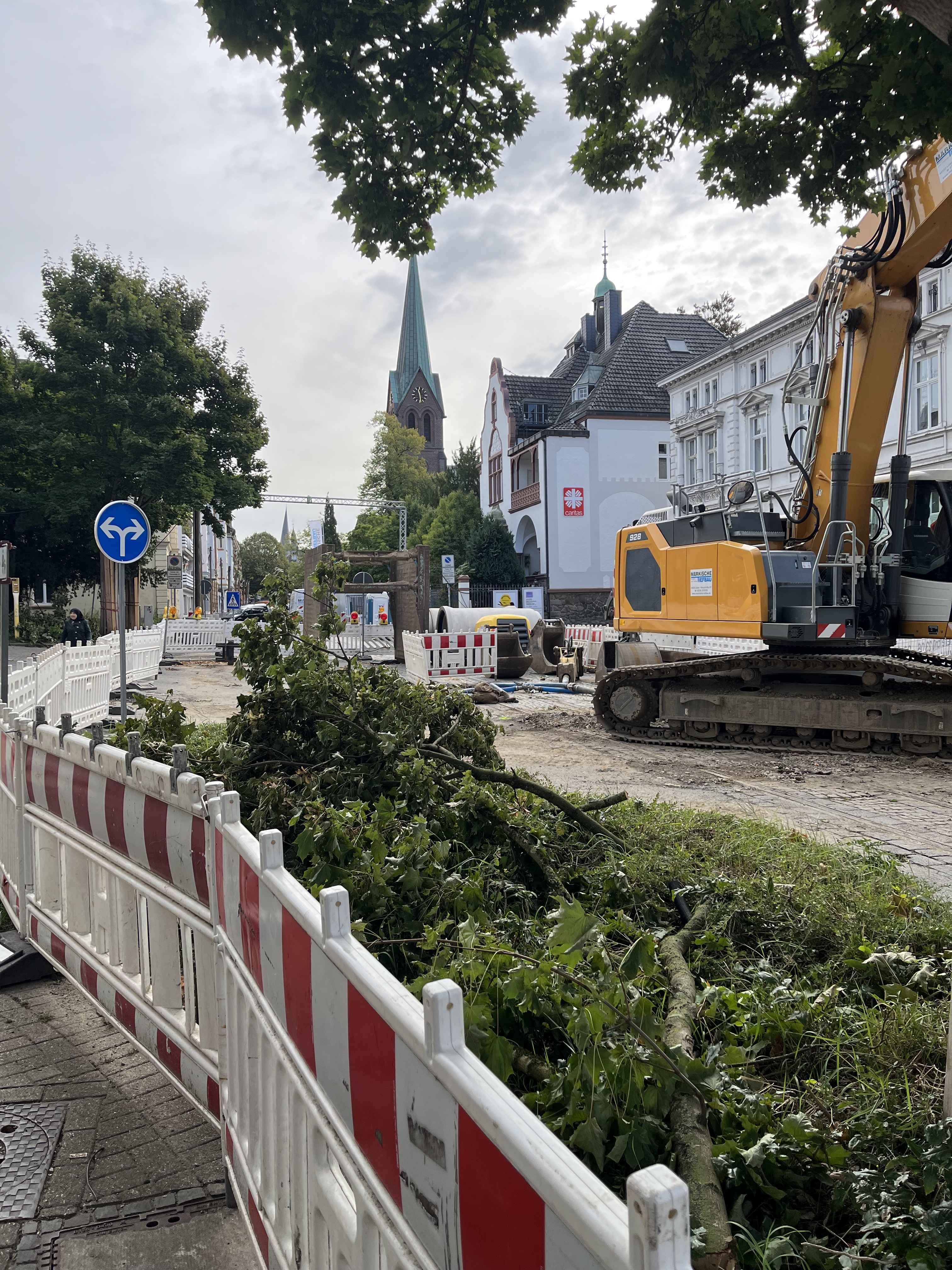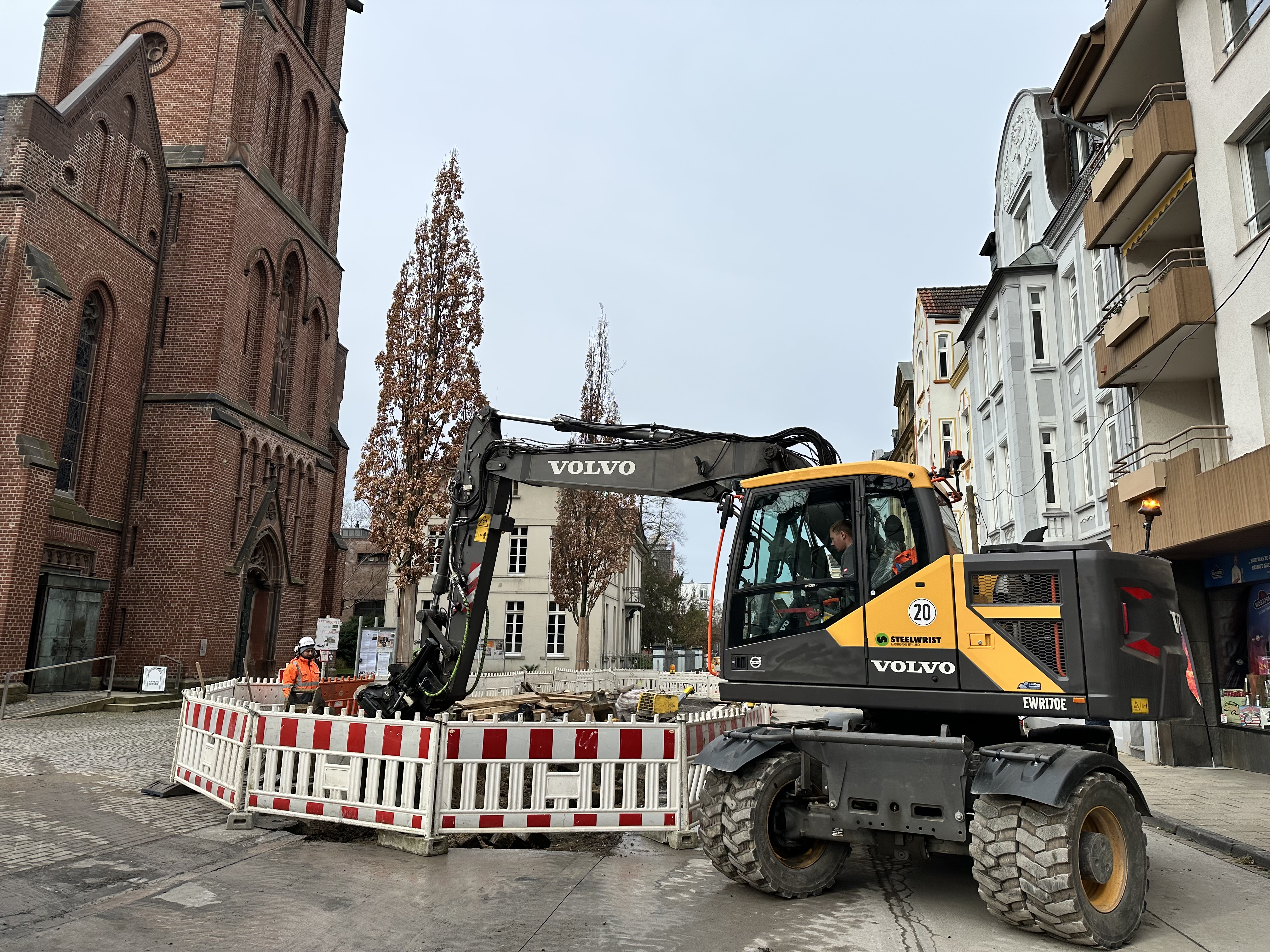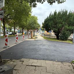 Zu Weihnachten wird die Zufahrt zur Kirche wieder hergestellt sein und dann wird weiter in Richtung August-Bebel-Straße gearbeitet. Die Gehwege auf der anderen Straßenseite werden dann in einem nächsten Bauabschnitte erneuert, dort werden auch Pflanzkübel eingebracht. Die Straße wird anschließend 5,5 Meter breit sein und es ist Tempo 20 vorgesehen. Gehwege und Fahrbahn sind höhengleich und heben sich optisch durch Material und Farbe voneinander ab.